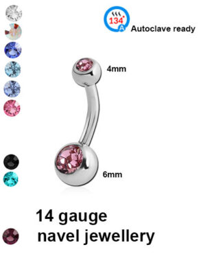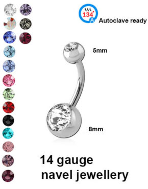 SBNDJ-14g Jewelled Surgical Steel Navel Bananas-4/6mm Jewelled Balls