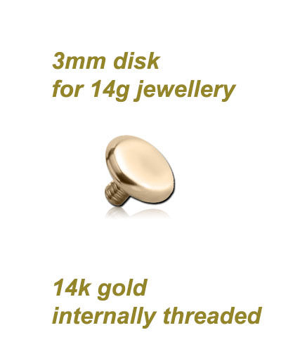 14k gold internally threaded flat disk for dermal anchors. Available in 3mm only.