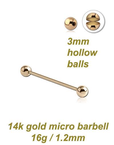 This 14k gold micro barbell comes with 3mm, 14k gold hollow balls.