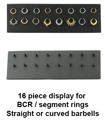 Attractive black wood rectangle display for BCR, segment rings and straight or curved barbells.