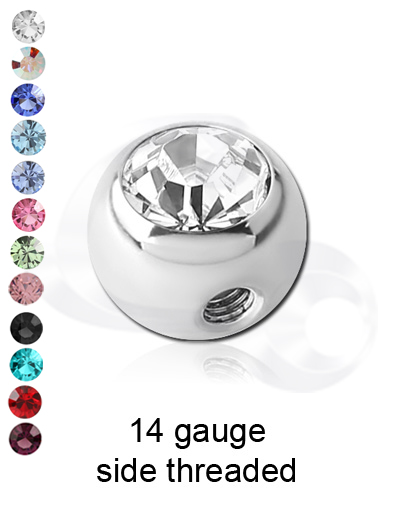 Side threaded jewelled surgical steel balls for 1.6mm/14g jewellery in a variety of colors.