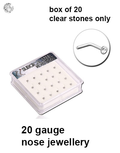 Box of 20 pieces, 316L surgical steel, bezel set, 20g nose studs with 90° bend. CR stone only.