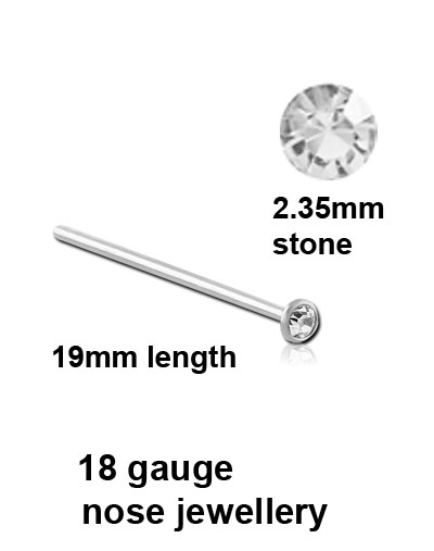 316L surgical steel large nose jewellery with 2.35mm bezel set stone. Length is 19mm.