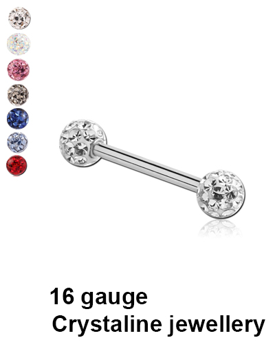 These 16g Crystaline micro barbells have a light epoxy coating to help prevent the individual stones from dislodging or falling out. They are not meant to be autoclaved.