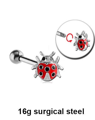 This 16g micro barbell has a surgical steel ladybug attachment and 3mm ball. Available in 6mm and 8mm length.