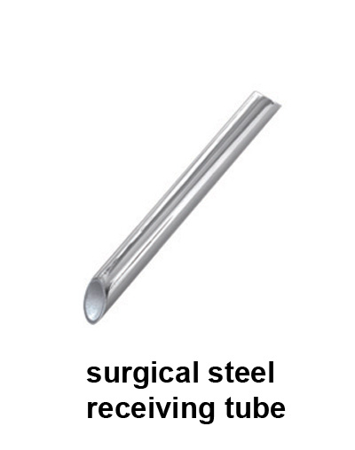 Receiving tubes are used to receive body piercing needles after a piercing. They aid in preventing needle prick and are a useful mechanism for protecting both the piercer and the client. These receiving tubes have a 45 degree angle on one end and a flat 90 degrees on the other end.