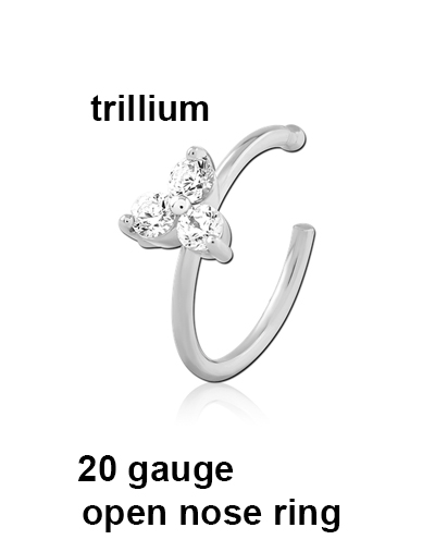 Trillium prong set jewelled surgical steel open nose ring in 20 gauge. CR only