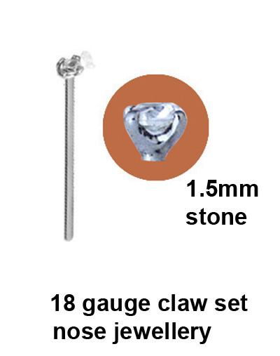 Surgical steel cast, prong set, jewelled nose screws with 1.5 mm stone.