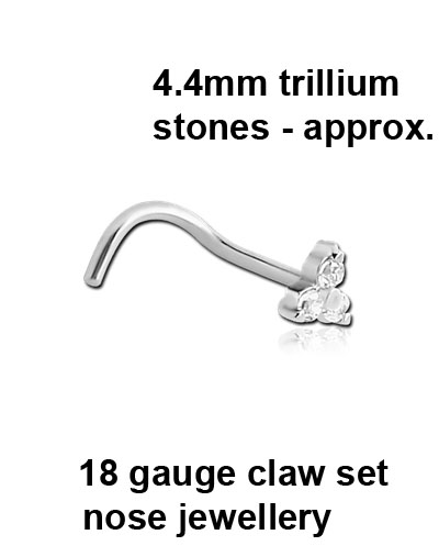 Surgical steel cast, prong set, jewelled trillium nose screws with 4.4mm stones approx.