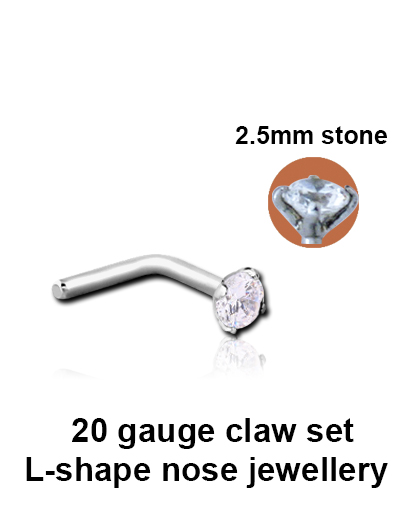 These L-shape nose screws are ideal for initial piercings.  The prong setting will hold up in the autoclave process and the stone is less likely to fall out with everyday wear.