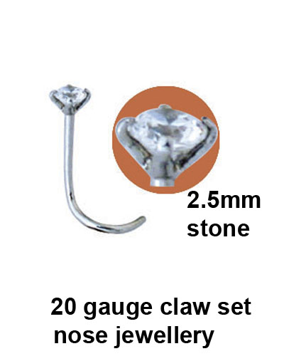 Surgical steel cast, prong set, jewelled nose screws with 2.5 mm stone