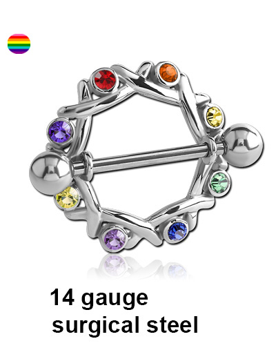 This 316L surgical steel rianbow jewelled nipple shield has 1.6mm external threading, making it most suitable for piercings that have already undergone the healing process.
