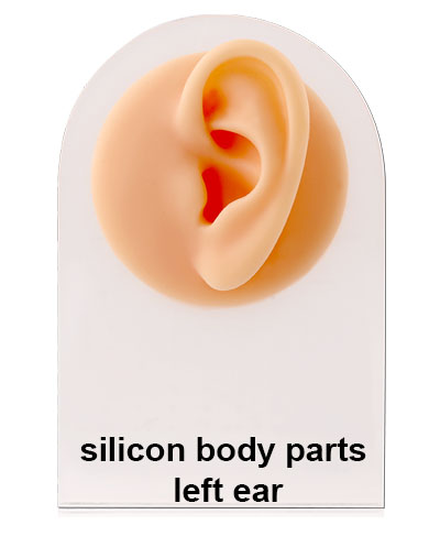 Silicon body part resembles a small-sized Left Ear with one stretched hole for plug/tunnel. A 3.25″ x 5″ plastic stand is included, which makes it perfect for a counter top display at your shop or your piercing room.