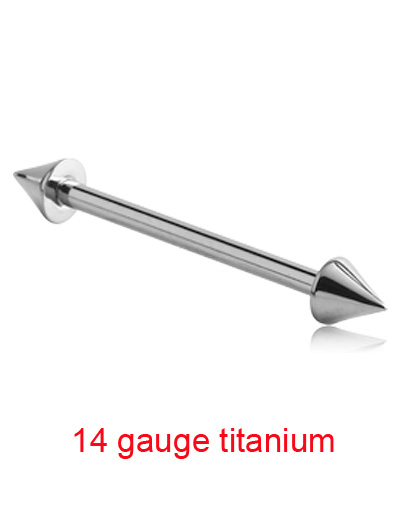Titanium 6AL-4V-ELI ASTM F-136 barbells with cones in 14g come in a variety of lengths for a wide range of piercing possibilities.