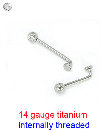 Each piece of Christina piercing jewelry comes with a 5mm clear gem ball on one end and a 4mm internally-threaded disc atop a 3mm rise on the other end (i.e. the short end of the L). Both end pieces are 14g internally-threaded, so they can be interchanged with other end pieces that have internal 1.2mm threading and that fit comfortably against the skin. (In other words, you might not want to put a pointy star top in place of the jeweled end, because it could dig into the skin above your Christina piercing.) The 5mm clear gem ball is fixed to the shaft. You can forcefully undo the ball, but in order for us to keep costs down, we line the clear gem straight and loctite into place.