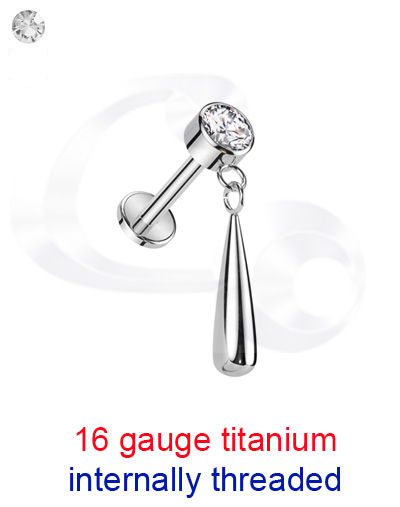 Titanium 6Al-4V-Eli ASTM F-136 internally threaded jewelled micro labret with dangling teardrop.