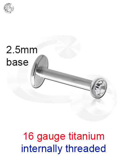 Titanium 6Al-4V-Eli ASTM F-136 Internally threaded 16g labret with 2.5mm base and 3mm jewelled half ball.