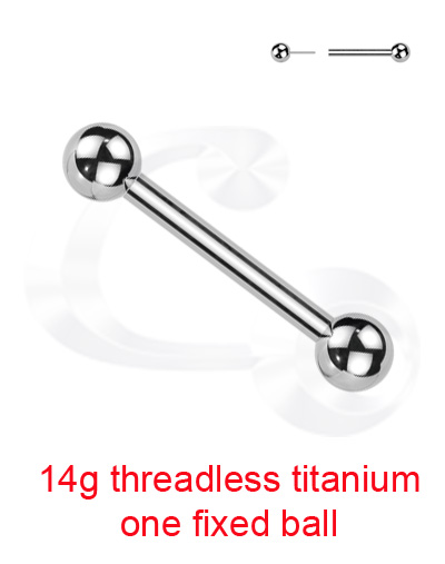Threadless Titanium 6Al-4V-Eli ASTM F-136 straight 14g barbell with one fixed ball.