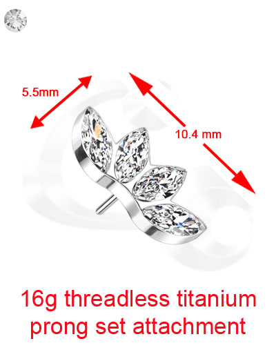 This Titanium 6Al-4V-Eli ASTM F-136 prong set 4 Marquise CZ attachment fits into threadless jewellery pieces like labrets, barbells, and more.