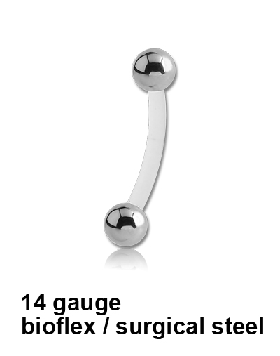 Bioflex 14 gauge navel bananas with 316L surgical steel balls. The bioflex is self threading and needs to be assembled with attachment.