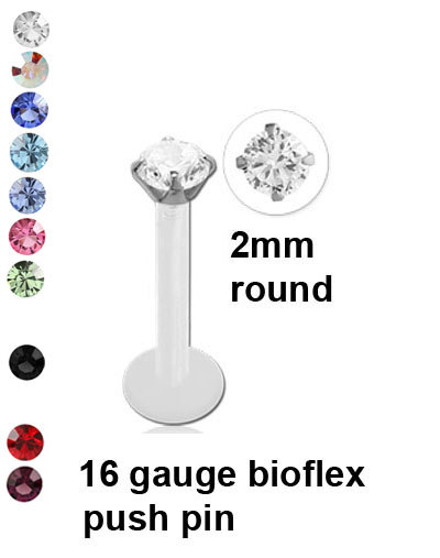 Bioflex internal labret pin with 3mm base or 4mm base –  Clear post – 2mm steel cast jewelled push pin attachment.