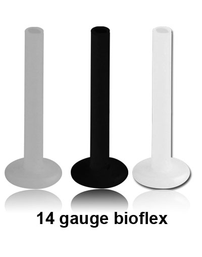 Bioflex micro labret (1.6mm / 14gauge) pins with 4mm base.  Bioflex is an excellent piercing material that can be steam sterilized or autoclaved.