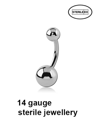 Sterile 14g surgical steel navel banana with 5/8mm balls. One time use only.