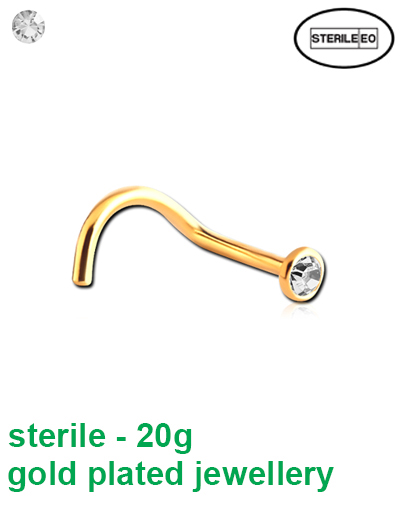 Sterile 20g gold plated (316L surgical steel) jewelled nose screw. One time use only.