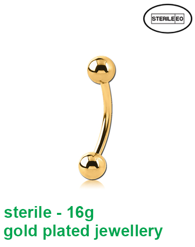 Sterile 16g gold plated (316L surgical steel) micro curved barbell. One time use only.