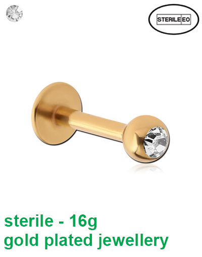 Sterile 16g gold plated (316L surgical steel) jewelled micro labret. One time use only.