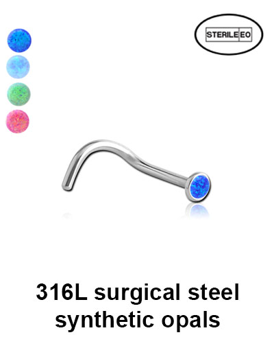 Sterile 18g surgical steel synthetic opal nose screw. One time use only.