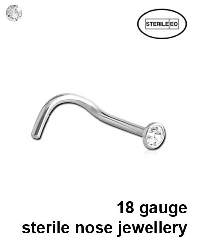 Sterile 18g surgical steel jewelled nose screw. One time use only.