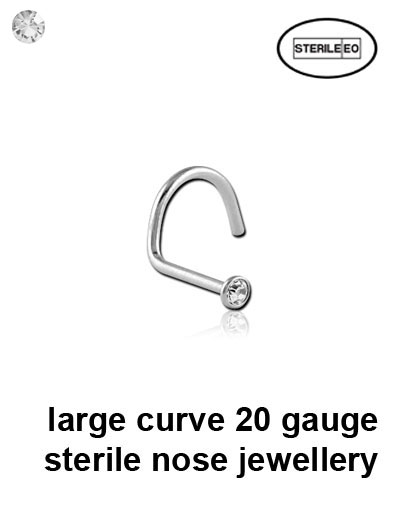 Sterile 20g surgical steel jewelled large curved nose screw. One time use only.
