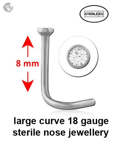 Sterile 18g surgical steel jewelled large curved nose screw with 8mm height. Regular height with all other nose screws is 6mm. One time use only. – Sterile code Z-JNO-1.0 x 8
