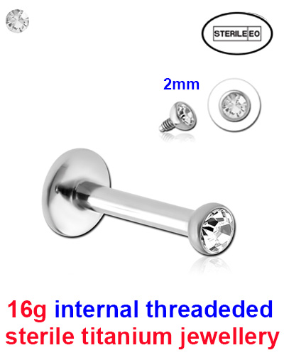 Sterile 16g Titanium 6Al-4V-Eli ASTM F-136 jewelled internally threaded micro labret.  One time use only.