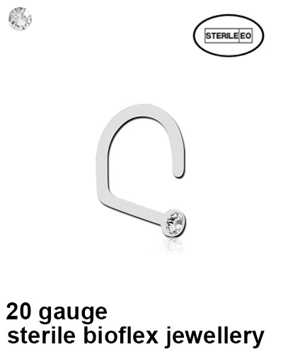 Sterile 20g bioflex nose screw with 2.35mm bezel set stone. One time use only.