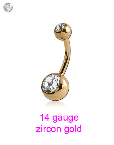 Zircon Gold is a surgical steel base with a golden colored PVD coating. The PVD formula is proven to be biocompatible and permanent. Autoclavable and ultra safe, Zircon Gold is an extremely high quality range of jewellery.